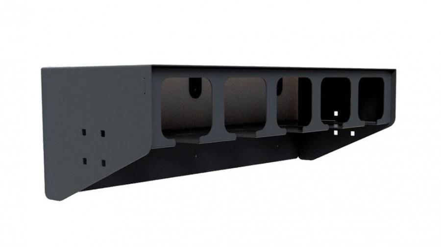 Egy robusztus fali tartó 5 elektromos behajtó, vagy például pneumatikus szerszám számára. A tartó felső része tökéletesen funkcionál akkumulátortöltő platformként is. Ellenálló fémből készült, tartós porfesték bevonattal.
