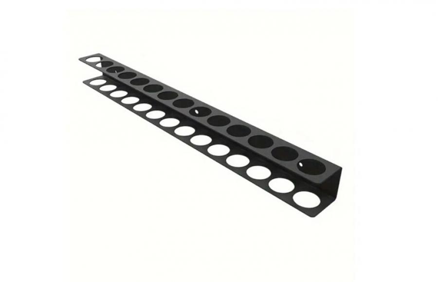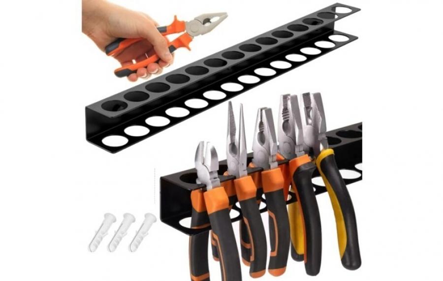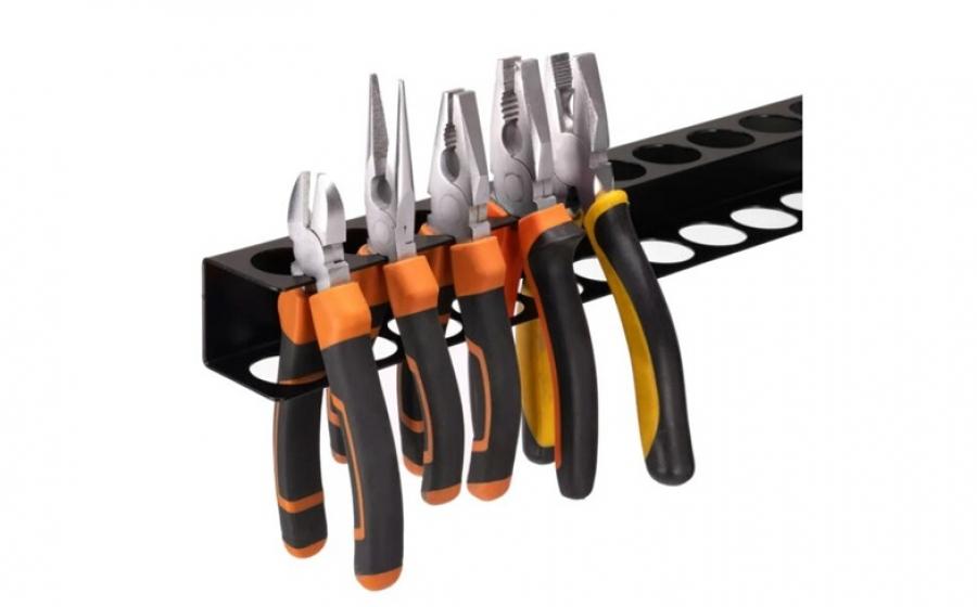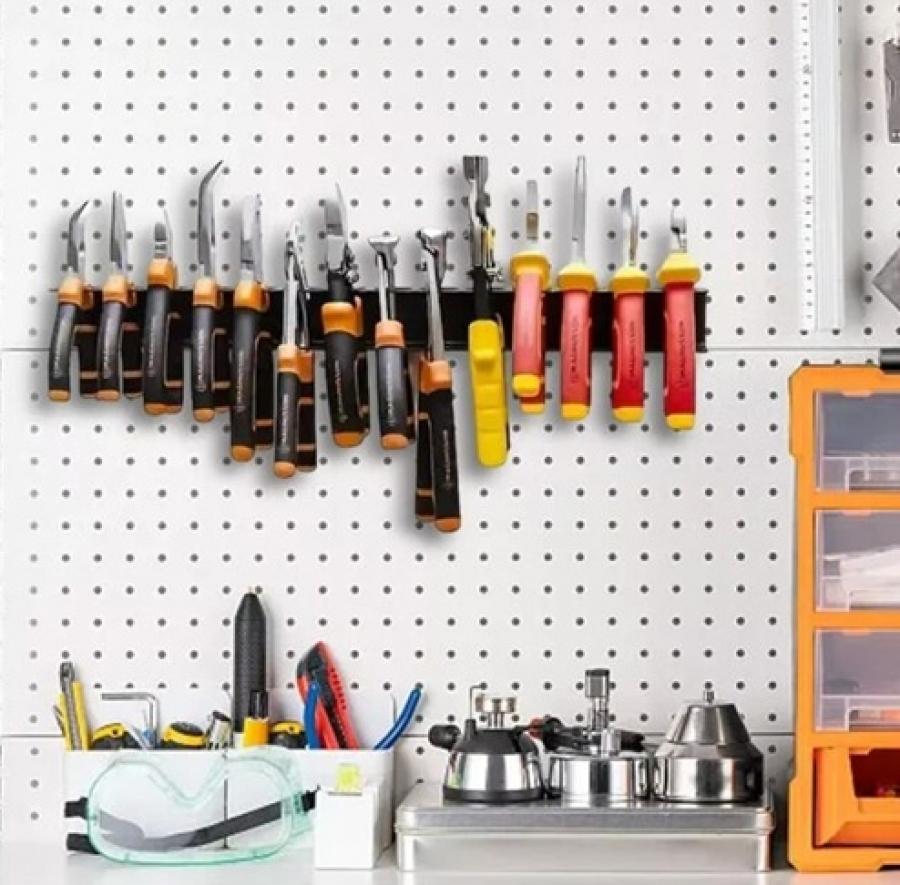 Falra szerelhető fém szerszámtartó, amely segít a kéziszerszámok (pl. csavarhúzók, fogók) rendszerezett tárolásában.