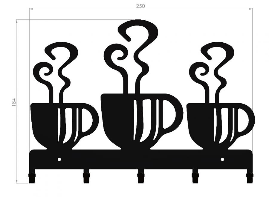 Kávés kulcstartó, 5 akasztóval, 25x17 cm, Fekete